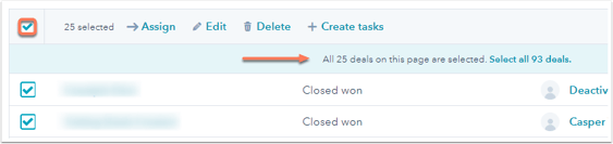 HubSpot allows you to edit your records in bulk. Contacts, companies, deals, tickets, custom objects, and calls are all included here. In bulk editing, you can, for example: