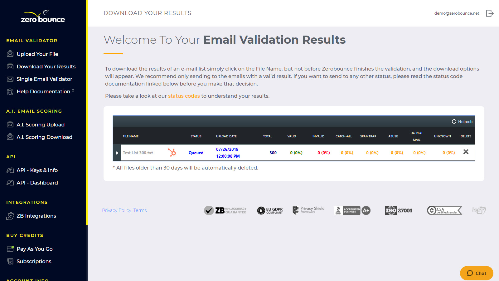 Email list validation is at the foundation of your email hygiene. But once you benefit from our email scrubbing service, try ZeroBounce A.I. to learn more about your results. ZeroBounce A.I. is an email scoring system that uses artificial intelligence to rate the value of an email address.